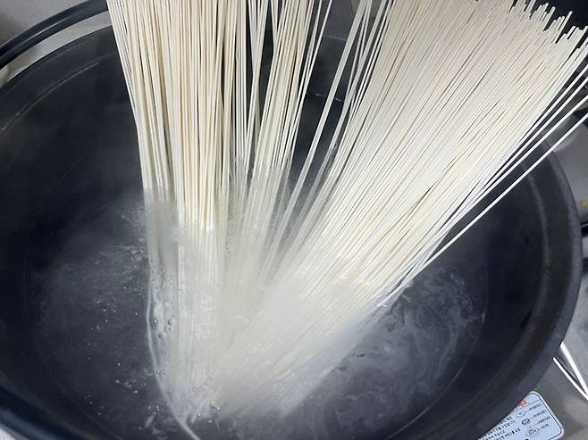소면을 끓는 물에 넣고 3분간 삶아서 익힙니다.