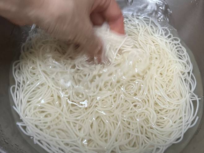 국수 만들 때 가장 중요한 과정 중 하나가 소면에 있는 전분기를 제거하는 것입니다. 물에 국수를 5번 정도 헹궈서 전분기를 최대한 제거하세요. 전분기가 남아 있으면 국물이 탁해지고, 국수도 금방 퍼지거나 들러붙기 쉽습니다.