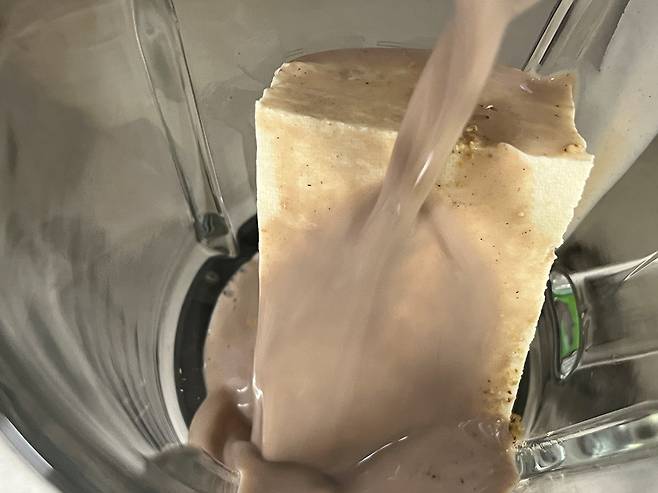콩물만 만들면 콩국수는 거의 완성인데요. 콩물을 콩 대신 두부로 만드는 것이 핵심입니다. 두부도 어차피 콩으로 만든 식품이기 때문에, 풍미와 영양은 그대로 유지하면서도 조리 과정은 훨씬 간단해집니다.