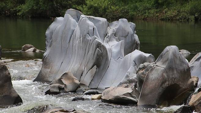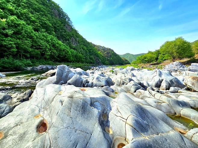 백석탄계곡의 진짜 매력은 하천 바닥의 흰 바위들이 오랜 시간 흐르는 물에 의해 깎여 만들어진 ‘포트홀’ 지형입니다. 물의 소용돌이에 의해 자연적으로 파인 이 독특한 지형은 국내에서 보기 드물며, 사진보다 실제로 봐야 그 아름다움을 실감할 수 있어요.