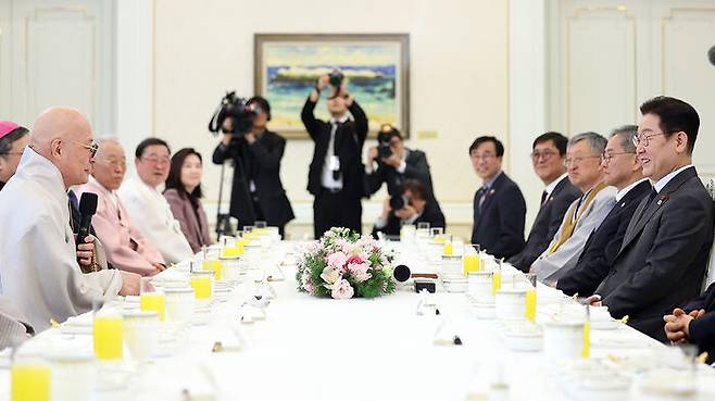 이 대통령은 "민생이나 한반도 평화 등 사회의 중요한 화두에 종교계가 올바른 방향을 말해 달라"며 "특히 외교나 안보처럼 국가 공동체의 존속이 달린 일을 정쟁 대상으로 삼으며 서로 싸우지 않게 '큰 가르마'를 타 주시면 좋겠다"고 당부했습니다.