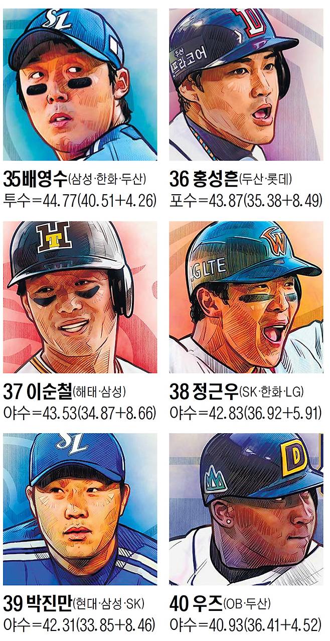 근소한 차이로 아쉽게 40인에 포함되지 못한 이들도 있다. 2000경기-2000안타에 빛나는 장성호는 40위 우즈에 단 0.32점 차로 밀려 아쉽게 41위가 됐다. 통산 337홈런을 날린 이호준은 42위, 태평양과 현대에서 마무리 투수로 맹위를 떨쳤던 정명원은 43위, 통산 최다인 17개의 그랜드슬램을 기록해 ‘만루의 사나이’로 불리는 이범호가 44위에 올랐다. 45위는 LG 신바람 야구의 주역이자 SK 왕조를 이끌었던 ‘캐넌’ 김재현, 46위는 최고 유격수 계보에서 빠지지 않는 류중일이다. 47위는 2002 한국시리즈 끝내기 홈런의 주인공 마해영, 48위는 100 완투라는 진기록을 쓴 ‘고무팔’ 윤학길이다. 49위는 통산 134승을 기록한 김원형, 50위는 16시즌 연속 세 자릿수 안타를 기록한 박한이가 이름을 올렸다.