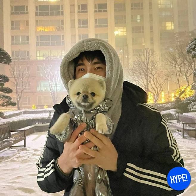 추워도 반려견 산책은 잊지 않는 남자.