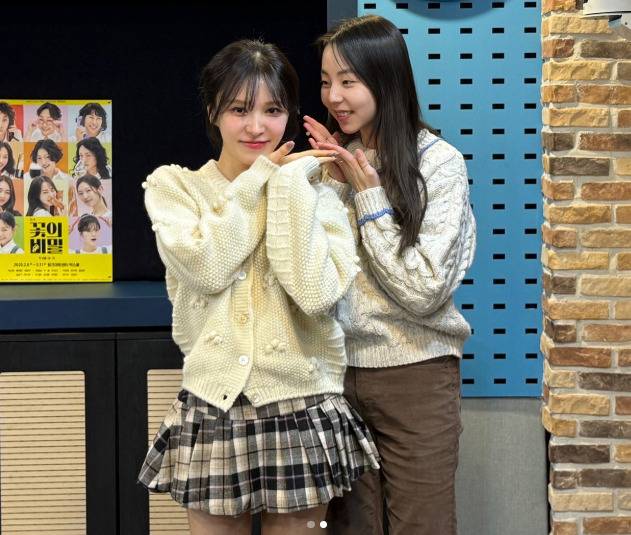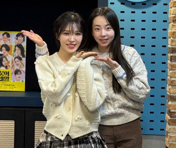 안소희와 웬디는 라디오 부스에서 나란히 사진을 남긴 모습. 강아지상 안소희와 고양이상 웬디의 케미가 돋보인다.