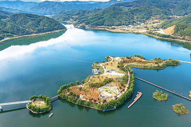 한반도섬은 파로호의 물길에 의해 형성된 섬으로, 위에서 내려다보면 대한민국 지도를 그대로 옮겨놓은 듯한 모습을 하고 있습니다.