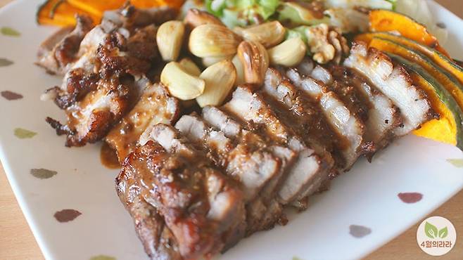 통삼겹살 1덩어리, 단호박 1/4개, 통마늘 한 줌, 견과류 (선택)