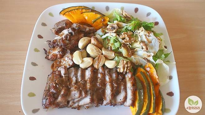 → 고기를 썰어 채소, 구운 단호박·마늘과 함께 담고 드레싱 뿌려 마무리합니다.