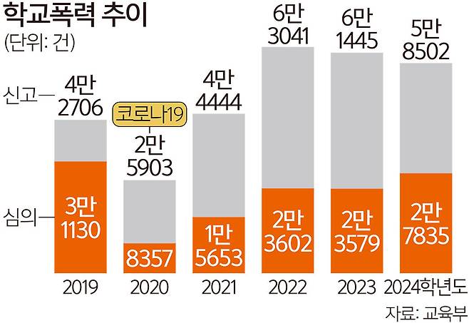 14일 교육부에 따르면 2024학년도에 전국에서 접수된 학교폭력은 5만8502건으로 전년도(6만1445건)보다 줄었지만, 학교에서 해결되지 않아 학폭위에 넘어간 사안은 2만3579건에서 2만7835건으로 오히려 늘었다.