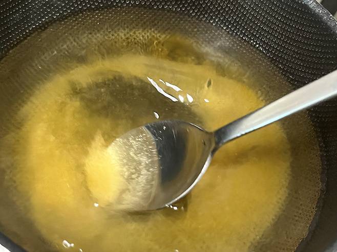 중 약불로 하여 설탕이 다 녹을 때까지만 끓여 주세요. 잘 저어서 설탕이 고르게 녹도록 합니다.