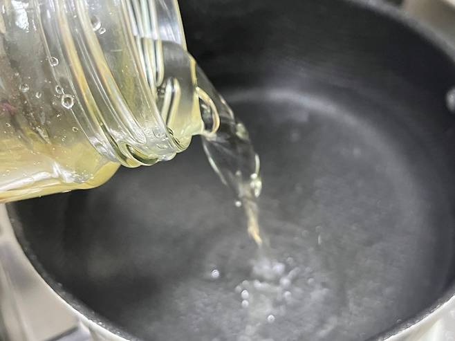 작은 냄비에 배합초를 끓입니다. 오이가 충분히 잠길 만큼 양을 만드세요. 물과 식초, 설탕을 2:1:1 비율로 맞추기만 하면 됩니다.