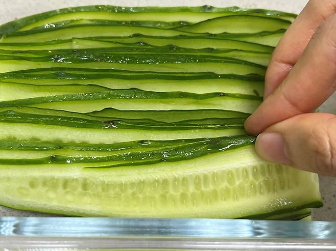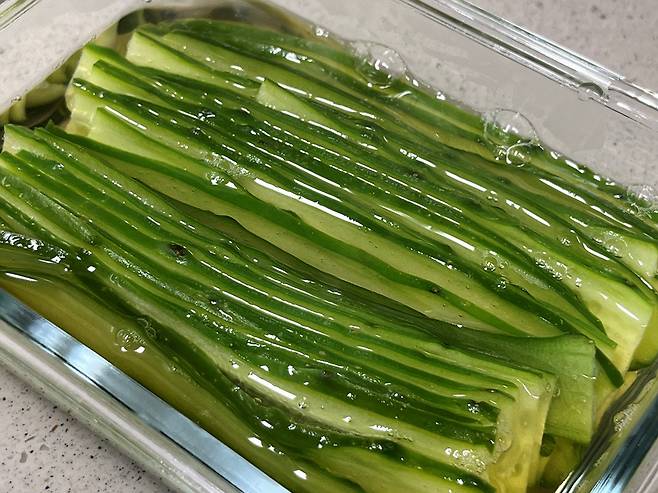 얇게 썬 오이는 차곡차곡 밀폐 용기 또는 유리병 등에 담으세요. 피클처럼 해 먹는 요리기 때문에 유리로 된 용기가 좋습니다.