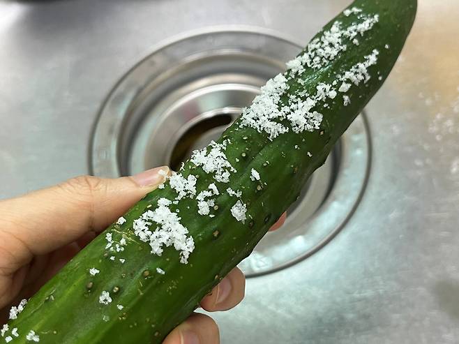 오이는 모양이 최대한 곧은 것으로 골라서 사세요. 오이 겉면에 굵은소금을 뿌려 문질러 주세요. 오이 표면의 농약이나 이물질을 깨끗이 없애는 과정입니다.