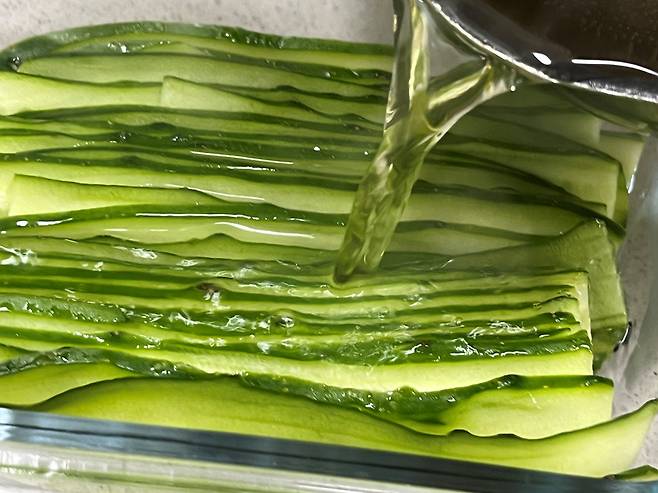배합초가 뜨거운 상태에서 오이에 그대로 붓습니다. 이렇게 하면 오이 특유의 아삭함을 살리면서도 간이 잘 배어들어 더욱 맛있습니다.