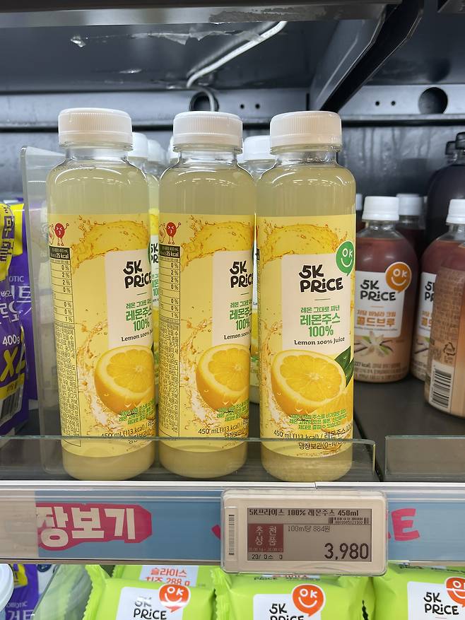 착즙 그대로의 상큼한 100% 레몬주스로 요리·음료에 활용도 높고 450ml 용량에 5천 원 이하라 가정용 레몬즙 대체품으로 가성비가 좋아요.