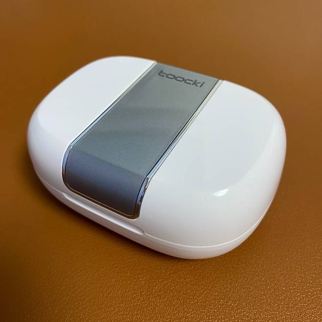 투키 귀걸이형 무선 이어폰 V90의 첫 인상은 고급지네요. 투키라는 프린트가 없다면 유명 브랜드의 제품이라고 해도 믿겠습니다. 케이스의 만듦새나 이어피스의 디자인이 싼티가 나지 않습니다. 케이스의 상단은 유광 플라스틱이며, 하단은 무광처리되어 있습니다. 처음에는 왜 서로 다른 재질로 처리되었는지 궁금했지만 유광과 무광을 교차하여 적용하기 때문에 그립감에도 도움이 되고, 단조로움을 피할 수 있는 것 같습니다. 특히 상단 중간을 가로지르는 실버 톤의 포인트가 디자인 요소이자 기능적으로 배터리 잔량을 보여주는 디스플레이 역할을 합니다.