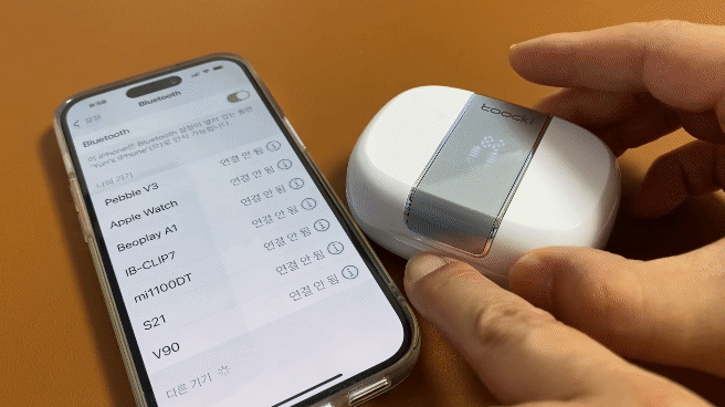 케이스를 열면 스위치가 작동하여 자동으로 이어피스 전원이 켜집니다. 그리고 동시에 페어링 모드로 들어갑니다. 만일 페어링이 이미 되어 있다면 페어링까지 해 줍니다. 이 과정이 2초도 걸리지 않습니다. 그리고 이 과정도 작은 목소리로 알려주고요. 투키 귀걸이형 무선 이어폰 V90에서 가장 장점이라고 생각됩니다. 케이스만 열면 바로 사용 준비가 되는 것이죠. 일부 제품은 케이스에서 꺼내어 전원을 켜고 귀에 끼운 후에야 페어링이 되는데, 이 제품은 그 과정이 생략되었으니까요. 마치 에어팟을 쓰는 느낌이네요. 무선 이어폰에서 사용자의 경험을 잘 이해한 것 같습니다.
