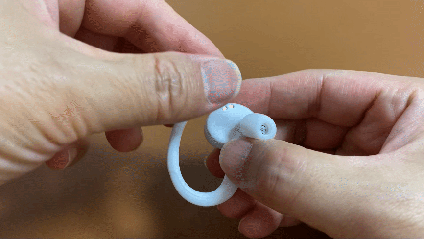 투키 귀걸이형 무선 이어폰 V90는 조작을 터치 방식으로 합니다. 주로 탭과 길게 누르는 방식입니다. 예를 들어 왼쪽이나 오른쪽 이어피스를 두번 탭하면 재생 정지되며 세번 탭하면 시리를 부릅니다. 길게 누르면 다음 곡 이전 곡이고요. 터치의 민감도가 정확도는 우수합니다. 하지만 사용하다 보니 몇 가지 불편함이 있더라고요. 탭하는 손가락의 강도에 따라 이어피스에 진동을 주어 귀에 쿵하는 소리가 전달됩니다. 터치 방식이기 때문에 세게 탭하지 말고 아주 살살 탭을 해야 합니다. 물론 살살해도 탭이 잘 인식됩니다. 그리고 음량이나 곡 이동은 좌우 이어피스에 각각 다른 동작이 할당되어 한쪽 귀에만 이어피스를 낄 경우 조절을 못합니다. 예를 들어 일을 하면서 왼쪽에만 이어피스를 착용할 경우 다음 곡으로 이동을 못하고 볼륨을 높일 수 없네요. 양쪽 이어피스 착용을 전제로 만든 제스처라 어쩔 수 없는 것 같습니다.