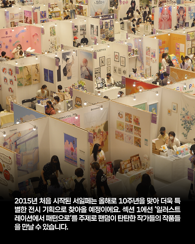 2015년 처음 시작된 서일페는 올해로 10주년을 맞아 더욱 특별한 전시 기획으로 찾아올 예정이에요. 섹션 1에선 ’일러스트레이션에서 패턴으로’를 주제로 아이스홍시, 크레용토끼, 파과 등 팬덤 탄탄한 작가들의 작품은 물론 이번 페어를 위해 다양한 브랜드와 아티스트가 준비한 굿즈들을 만날 수 있습니다. 섹션 2는 패턴 전문 디자인 스튜디오 로야마드를 중심으로 ‘화려한 설렘이 반복되는 패턴의 세계’를 탐구할 수 있어요. 섹션 3에선 패턴을 영상과 AR 경험으로 확장한 공간까지 준비했다고 하네요.