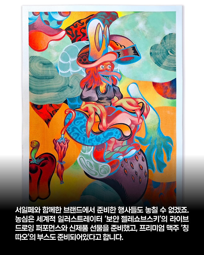 서일페와 함께한 브랜드에서 준비한 행사들도 놓칠 수 없겠죠. 농심은 세계적 일러스트레이터 ‘보얀 젤레쇼브스키’의 라이브 드로잉 퍼포먼스와 신제품 선물을 준비했어요. 프리미엄 맥주 칭따오에선 ‘따오의 행운슈퍼’ 부스로 관람객에게 큰 재미를 선사합니다.