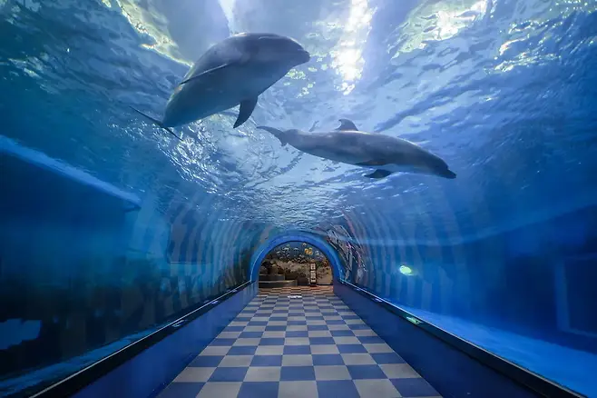 수조 공간은 생각보다 깊고 넓어 돌고래들이 자유롭게 움직이는 모습을 지켜보기 좋습니다. 아이들 눈높이에 맞춘 해양생물 자료와 교육 코너도 마련되어 있어, 단순한 놀이 이상의 유익함을 기대할 수 있어요.
