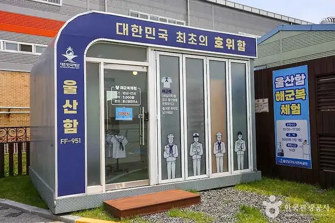 고래문화마을에서 조금만 걸어가면, 전혀 다른 느낌의 볼거리를 만날 수 있습니다. 실제로 사용되었던 퇴역 군함 ‘울산함’을 그대로 전시해 놓아 탑승 체험이 가능한 공간인데요, 거대한 함체가 주는 위엄이 대단합니다.