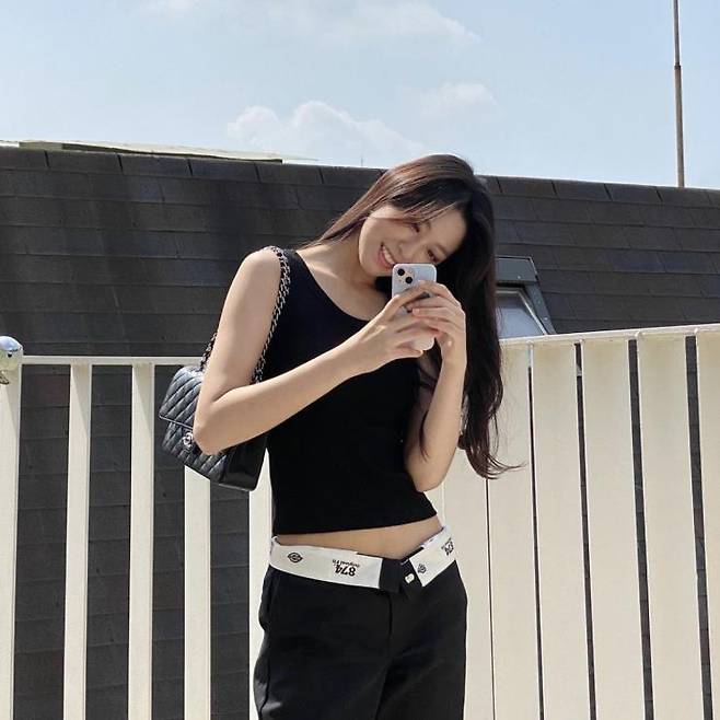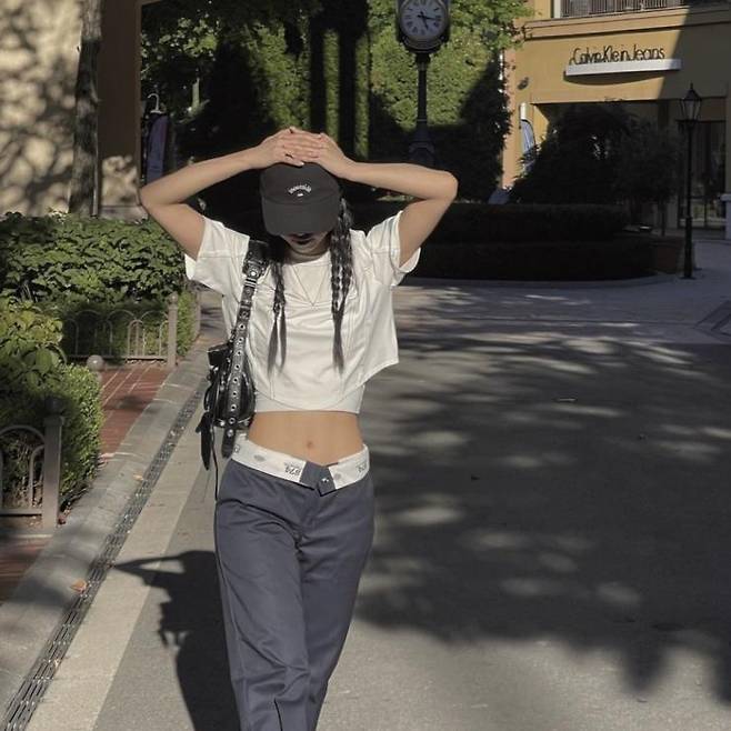 평소 카고팬츠 입은 모습을 많이 보여줬던 제니! 디키즈 874 팬츠를 접어 입는 유행에도 동참했어요~ 크롭 슬리브리스 탑과 함께 매치해 깔끔하면서도 힙한 룩을 연출했네요.
