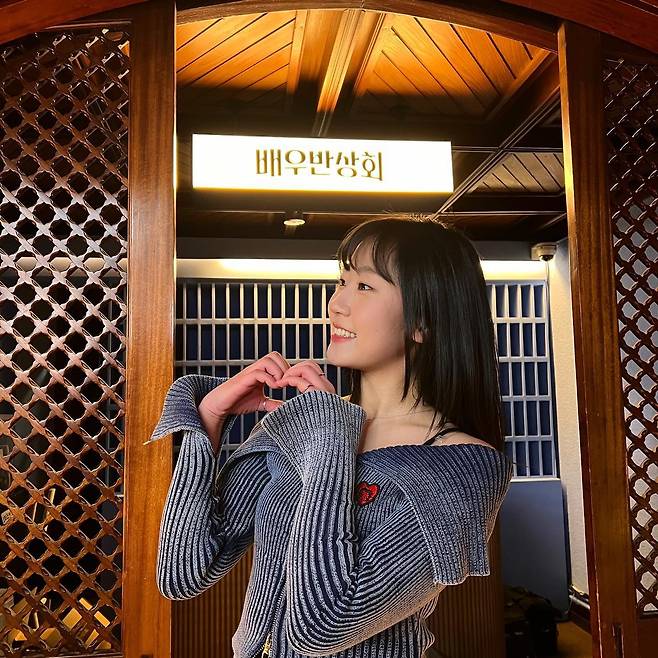 그레이 스트라이프 패턴의 오프숄더 니트를 착용해 트렌디한 감각을 보여주고 있다. 하트 모양의 포인트 액세서리와 함께 '배우만방회' 간판 앞에서 사랑스러운 포즈를 취하며 밝은 미소로 친근한 매력을 발산하고 있다.