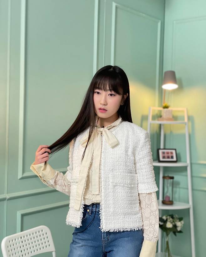 화이트 트위드 재킷과 리본 블라우스의 조합으로 고급스러운 분위기를 자아내고 있다. 데님 팬츠와 매치하여 격식과 캐주얼함을 동시에 표현하였으며, 긴 생머리와 핑크빛 립 메이크업으로 여성스러움을 강조하고 있다.
