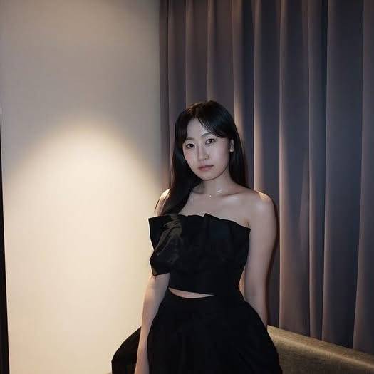 우아한 블랙 오프숄더 크롭톱과 하이웨이스트 스커트로 절제된 섹시미를 선보이고 있다. 미니멀한 디자인의 상의와 풍성한 실루엣의 스커트가 조화를 이루며, 긴 생머리와 자연스러운 메이크업으로 청순한 매력을 더하고 있다.
