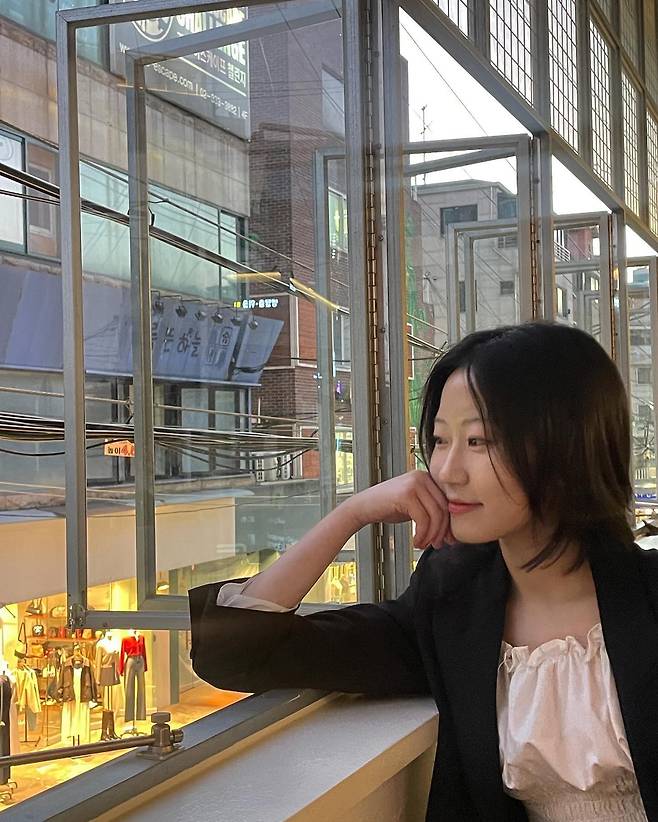 블랙 재킷과 화이트 러플 블라우스의 대비되는 컬러 매치로 세련된 스타일을 완성하고 있다. 쇼윈도우를 배경으로 한 자연스러운 포즈에서 도시적인 감각이 돋보이며, 단정한 헤어스타일로 지적인 매력을 더하고 있다.