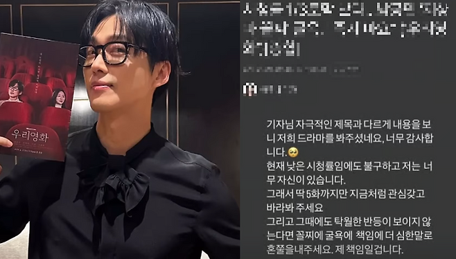 이어 “딱 5회까지만, 지금처럼 관심 갖고 지켜봐 달라. 그때도 변화가 없다면 비판도, 책임도 달게 받겠다. 내 책임”이라는 말로 배우로서의 책임감을 강조해 팬들의 응원을 자아냈다.