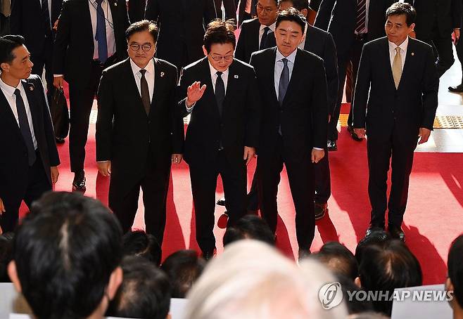 (서울=연합뉴스) 이재명 대통령이 4일 내년도 정부 예산안에 대한 시정연설을 하기 위해 서울 여의도 국회에 도착해 피켓시위를 하는 국민의힘 의원들 앞을 지나고 있다. 국민의힘 의원들은 추경호 전 원내대표에 대한 내란특검팀의 영장청구에 반발하며 야당 탄압 중단을 촉구했다. 2025.11.4 [국회사진기자단]
