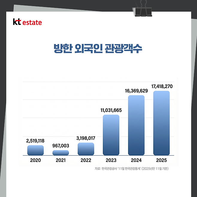 한국관광공사에 따르면 올해 1~11월 방한 외국인은 1,742만 명으로 전년 동기 대비 15.4% 증가했으며 이미 지난해 연간 수치를 넘어섰습니다.