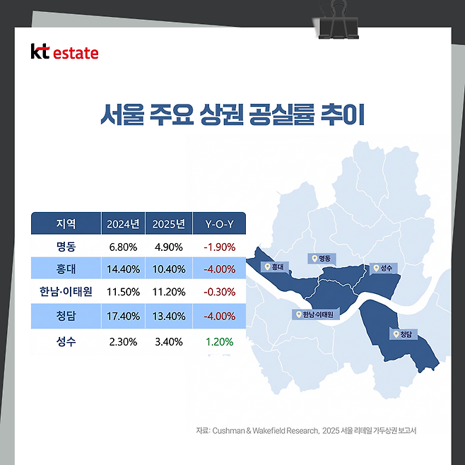 이 보고서에서 언급한 2025년 서울 7대 가두 상권의 공실률에 따르면, 외국인 관광객의 방문이 많은 홍대, 청담, 명동, 강남 등의 공실률이 전년에 비해 빠르게 회복하고 있습니다.