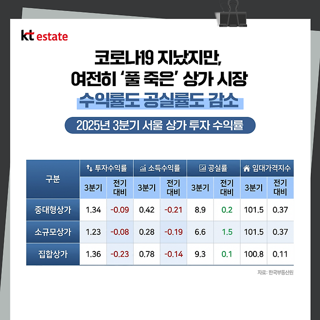 한국부동산원에서 발표한 2025년 3분기 상업용 부동산 임대동향조사 결과에 따르면, 서울 상가 투자 수익률은 모두 감소했습니다. 중대형 상가는 1.34%로 전기 대비 0.09%p 하락했고, 소규모 상가는 1.23%(-0.08%p), 집합 상가는 1.36%(-0.23%p)를 나타내며 동반 하락세를 보였습니다.