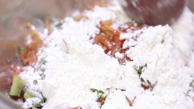 이제 물을 제외한 모든 재료를 볼에 넣고 함께 섞어 주세요. 여기에 튀김가루가 더해져 더욱 바삭한 식감이 좋아요.