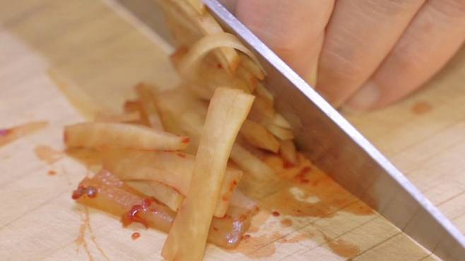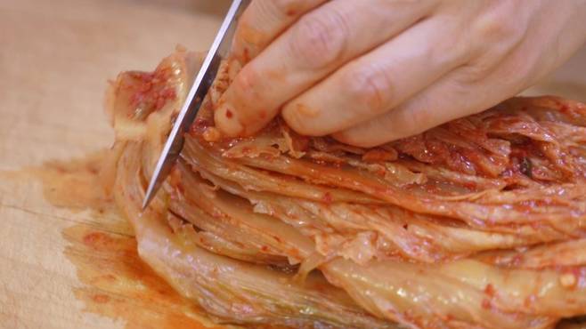 먼저 김치 꼭지 부분은 제거한 후 김치를 채 썰어 주세요. 이때 김치 속은 미리 털어낸 후 사용해야 더욱 깔끔하고 좋답니다.