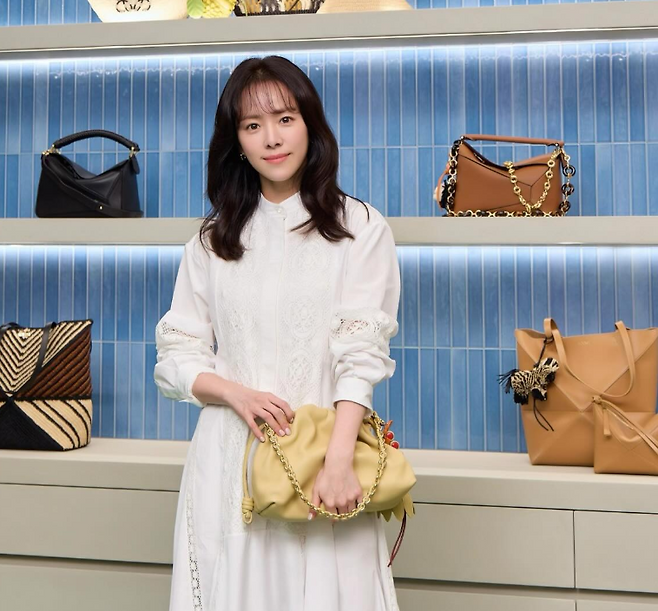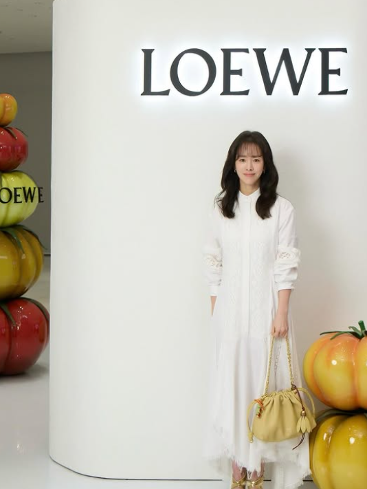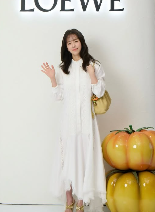화이트 원피스 하나만으로도 충분히 눈에 띄는 룩이었지만, 여기에 매치한 가방이 센스를 더해주었습니다. 그녀가 선택한 가방은 로에베의 핸드백으로, 은은한 버터 컬러가 인상적인 아이템이었어요.