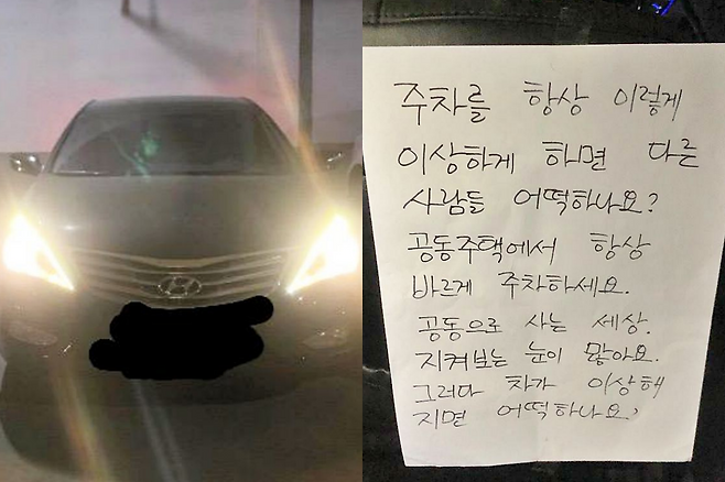 공개된 메모에는 “주차를 항상 이렇게 이상하게 하면 다른 사람들 어떡하나요? 공동으로 사는 세상, 바르게 주차하세요. 지켜보는 눈 많아요. 그러다 차가 이상해지면 어떡하나요?”라는 경고성 문장이 적혀 있었다. 이를 본 A 씨는 “이게 왜 민폐인지 모르겠다”라며 억울함을 토로했다. 네티즌도 “차가 문제 있는 게 아니라 아무리 봐도 메모가 문제”라는 반응을 보였다.