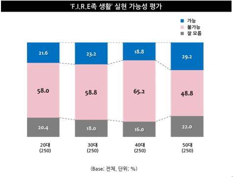 한편 현실적으로 F.I.R.E족 생활을 할 수 있는 가능성에 대해서는 대체로 낮게 평가된 것으로 나타났다. 50대의 경우 상대적으로 긍정적 전망(20대 21.6%, 30대 23.2%, 40대 18.8%, 50대 29.2%)이었으나 이 역시 낮은 수준이었다. F.I.R.E족 생활이 불가능하다고 생각하는 이유는 경제적 자유를 누리기 위한 자금 마련이 어렵다는 의견이 높았다.