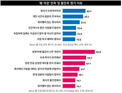직장인 절반만 회사·업무에 대해 만족···불만족 이유로 적은 월급, 빈약한 사내 복지 순