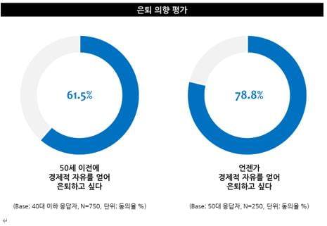 특히 현 직장에 대한 불만이 높은 응답자일수록 이른 은퇴를 원하는 비율이 높게 나타난 특징(20~40대 직장 불안정 54.5%, 불만족 79.4%, 비교적 이상적 59.5%, 50대 직장 불안정 80.3%, 불만족 89.7%, 비교적 이상적 76.1%)을 보였다. 이는 직장생활에서의 불만과 스트레스가 삶 전반에 영향을 주고 있는 것으로 짐작할 수 있는 결과다.