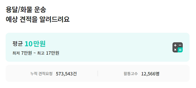 숨고 내에서 거래되는 용달/화물 운송 평균 비용은 건당 10만 원입니다. 최저 비용은 7만 원, 최고 비용은 17만 원으로 책정되어 있어요.