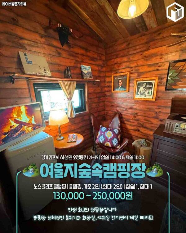 여덟 번째는 경기도 김포시 하성면에 위치한 여울지숲속캠핑장입니다. 노스클리프 스타일의 원목 인테리어가 돋보이는 실내 공간은 감성을 자극하며, 캠핑장 전체적으로 분위기와 청결도가 우수해 특히 여성 캠퍼에게 인기가 높은 서울 경기 인근 추천 글램핑장입니다.