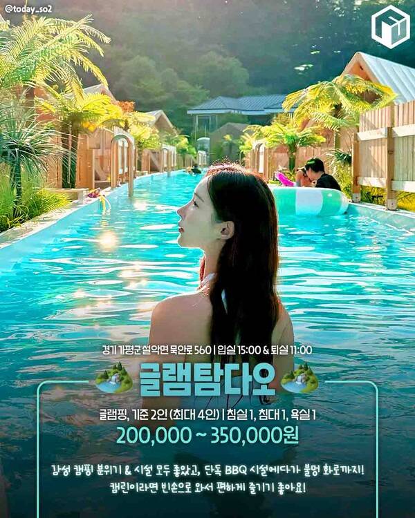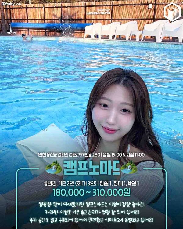 수영장과 휴게공간도 잘 마련되어 있어 도심에서 벗어난 완벽한 힐링을 누릴 수 있으며, 가격은 18만 원부터 31만 원대입니다. 기준 2인(최대 3인)까지 숙박 가능해 몸만 가면 되는 감성 글램핑 명소로 추천드립니다.