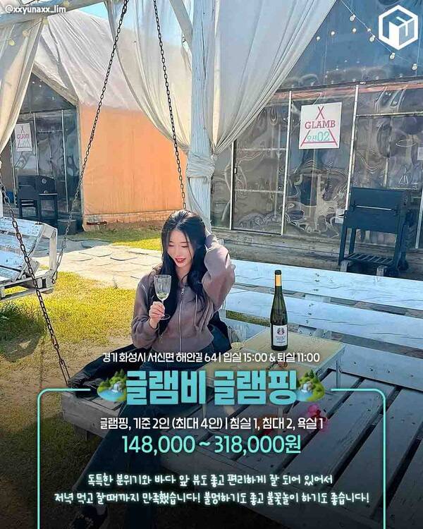 두 번째는 경기도 화성시 서신면에 위치한 글램비 글램핑입니다. 바다가 바로 앞에 펼쳐진 독특한 분위기의 캠핑장으로, 자연 속에서 제대로 힐링할 수 있는 뷰맛집입니다.
