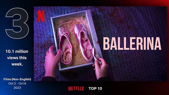 11일 넷플릭스에 따르면 이충현 감독이 연출한 '발레리나'(제작 클라이맥스 스튜디오)는 지난 6일 공개 후 3일 만에 프랑스, 독일, 이탈리아, 일본 등을 포함해 62개국 국가에서 '톱10' 리스트에 이름을 올리고, 넷플릭스 글로벌 '톱10' 영화(비영어 부문) 3위를 기록했다.