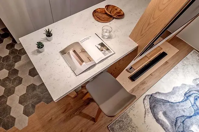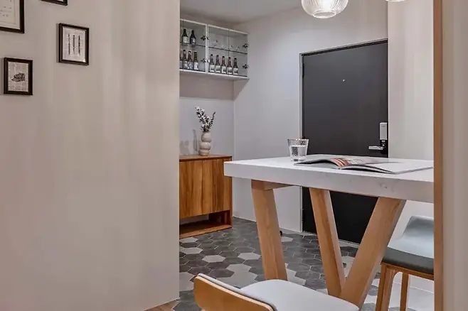 원목 톤과 육각 타일, 지그재그 패턴이 결합된 현관은 단순한 통로를 넘어 집에 들어서는 ‘순간의 온기’를 전한다. 현관과 주방을 잇는 동선에는 수납이 세심하게 설계되어 고요한 실내 분위기와 실용성을 동시에 만족시킨다.