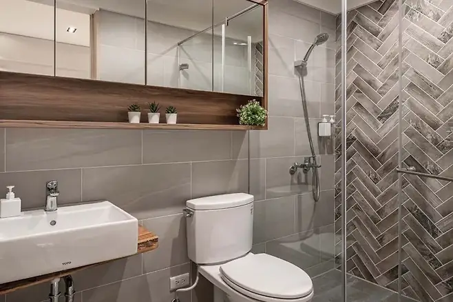 수납장은 거울과 창을 조화시켜 빛과 공기의 흐름을 살렸다. 벽면 타일은 브라운 무늬의 헤링본 패턴으로 배치되어, 나무 통일감과 연결감을 맺는다. 청소가 쉬운 이동식 가구는 공간을 덜어내고 삶을 채울 여백을 마련한다.