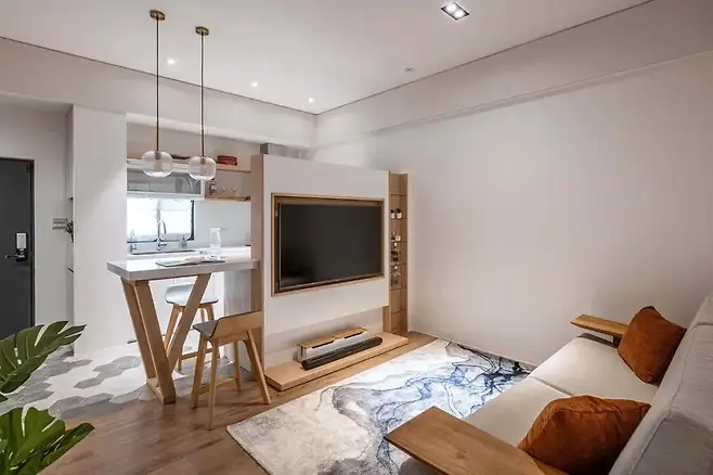 거실은 낯선 이중 목적 설계로 주방과의 숨은 경계를 드러낸다. 낮은 벽은 흐름을 방해하지 않으면서도 시선을 자연스럽게 분리한다.
